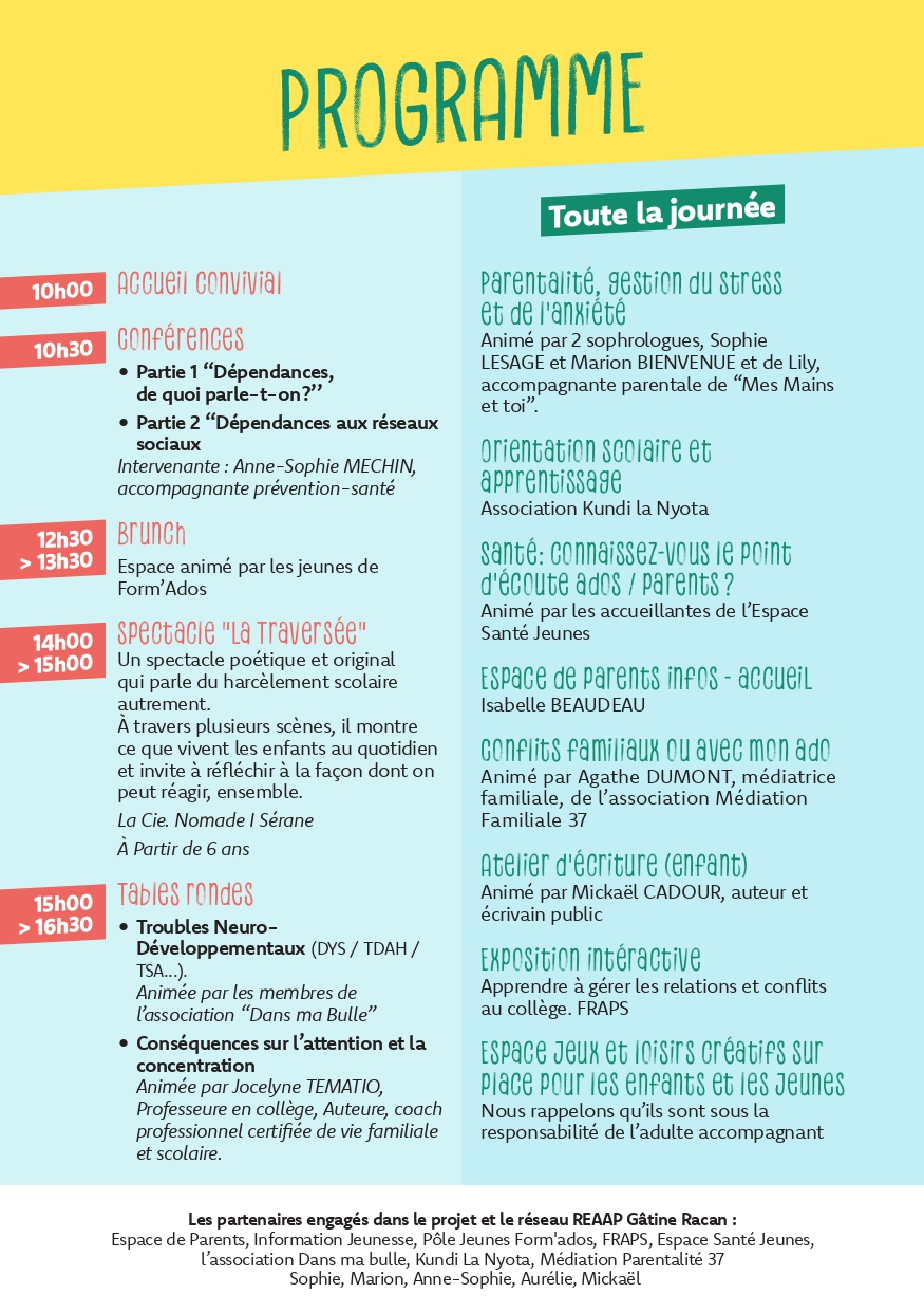 Dans le cadre du Réseau d’Écoute, d’Appui et d’Accompagnement des Parents (REAAP) de la Communauté de communes Gâtine-Racan, nous organisons le Brunch #2 : “Comprendre, prévenir et agir pour une année scolaire sereine”, le samedi 20 septembre de 10h à 16h30 à la salle des fêtes de Neuillé-Pont-Pierre.