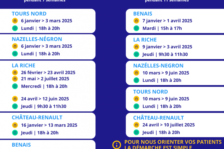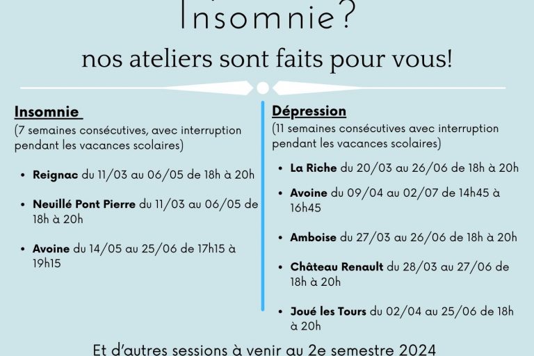 En partenariat avec le dispositif médecine générale & psychiatrie 37. Une session de psychothérapie de groupe TCC pour la prise en charge de l’épisode dépressif unipolaire d’intensité légère à modérée (sur orientation médicale) se déroulera du mardi 8 novembre 2022 au mardi 31 janvier 2023à NEUILLÉ PONT PIERRE (Maison Départementale de la Solidarité)de 18h à 20h →…
